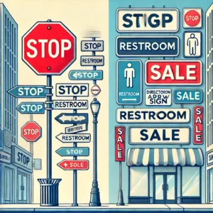 DALL·E 2024-08-28 22.55.54 – An illustration depicting the difference between a single sign and signage. On one side, show a simple street sign with the word ‘STOP’ in red, and on